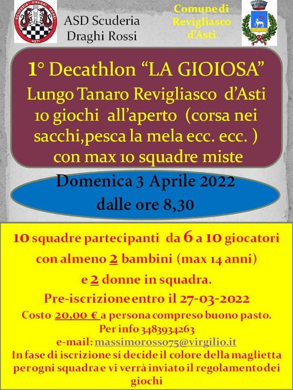 Un'iniziativa della Scuderia Draghi Rossi e del Comune di Revigliasco. Con l'occasione, infatti, verrà presentata la nuova area, frutto di un importante intervento di riqualificazione. I Draghi, infatti, negli ultimi mesi si sono dedicati quotidianamente alla pulizia della zona, tra rifiuti di ogni genere.