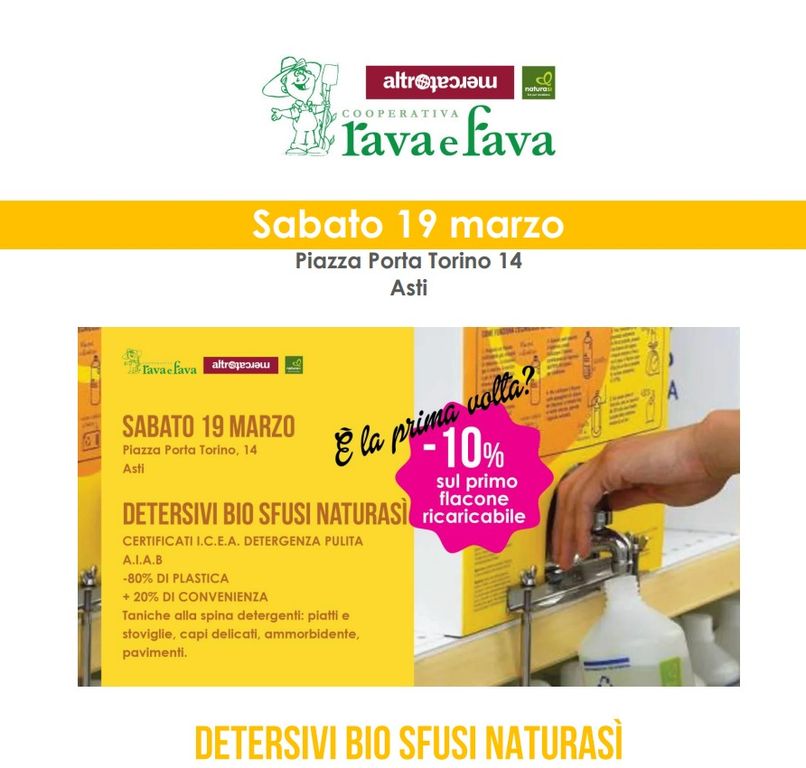 Sabato 19 marzo Progetto Plastic Free - Zero Rifiuti con la proposta dei detersivi ecologici alla spina certificati ICEA e detergenza pulita AIAB