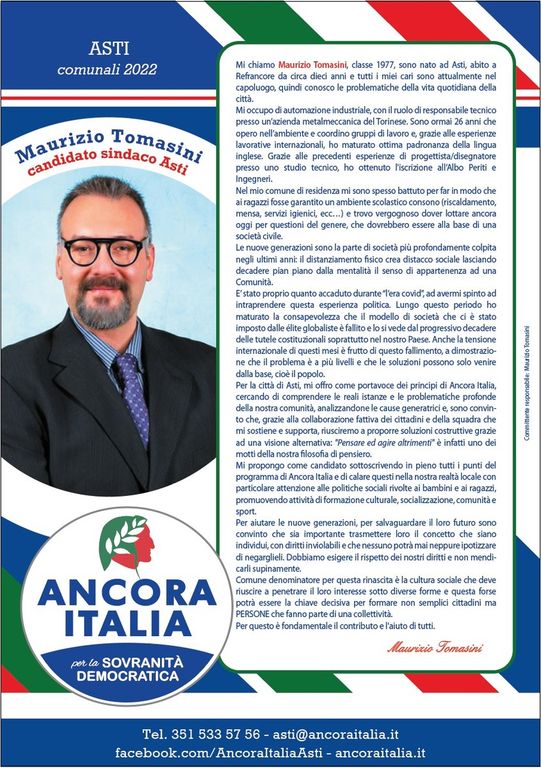 Domenica sarà quindi presentata la lista e il programma a partire dalle 10 nei pressi della giostra lato corso Galileo Ferraris, alla presenza di Antonello Cresti, saggista e musicologo, vice presidente di Ancora Italia, Francesco Toscano, giornalista, presidente e Paolo Borgognone, scrittore e saggista.