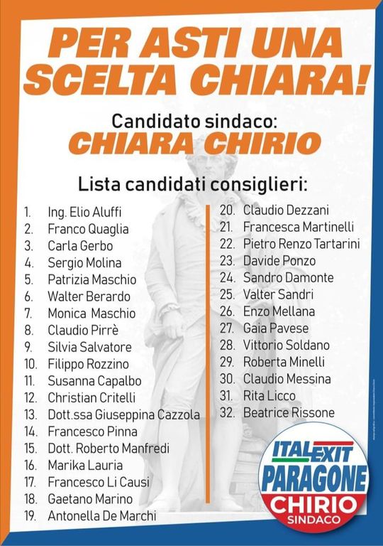 Sono alcune delle principali proposte illustrate questo pomeriggio da Chiara Chirio, candidata sindaco di Asti per Italexit, affiancata nel corso della conferenza stampa di presentazione della lista dal coordinatore nazionale Luciano Bosco, dal coordinatore provinciale Franco Quaglia e dalla coordinatrice politica cittadina Carla Gerbo.