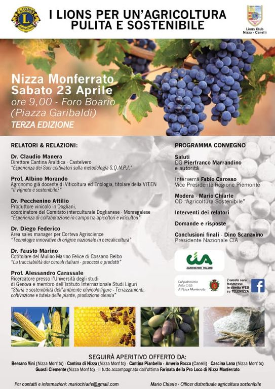 "I Lions per un'agricoltura pulita e sostenibile" è il titolo del convegno che si terrà il prossimo 23 aprile alle 9 a Nizza, al Foro Boario.