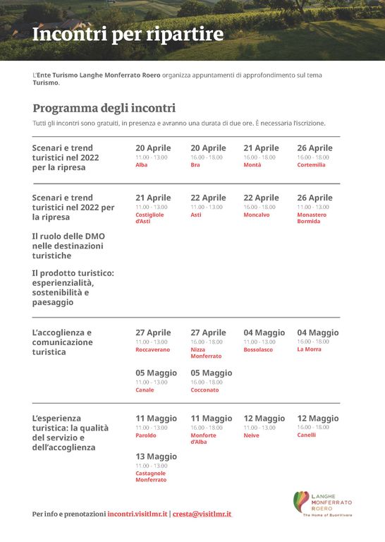 Sono iniziati ieri, mercoledì 20 aprile, gli “Incontri per ripartire”, organizzati da Ente Turismo Langhe Monferrato Roero. Si tratta di una serie di appuntamenti, gratuiti e in presenza, dedicati agli operatori della filiera turistica in ambito pubblico e privato.