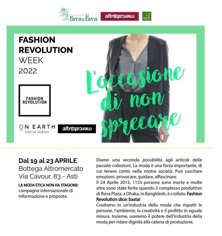 Alla Bottega Rava e Fava di via Cavour 83 ad Asti fino a sabato 23 aprile, continua la promozione della campagna internazionale 'Fashion Revolution Week 2022'.