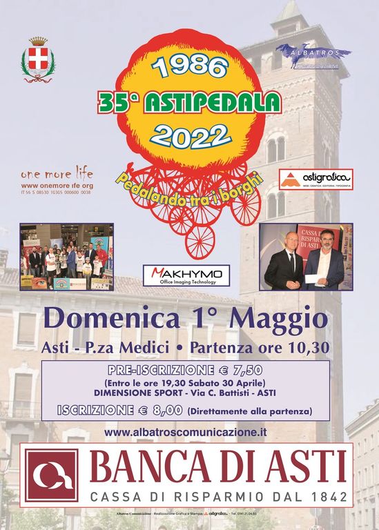 Torna 'Astipedalando tra i... borghi', giunta alla 35esima edizione e organizzata da Albatros Comunicazione con il patrocinio del Comune di Asti.