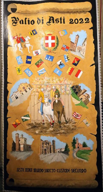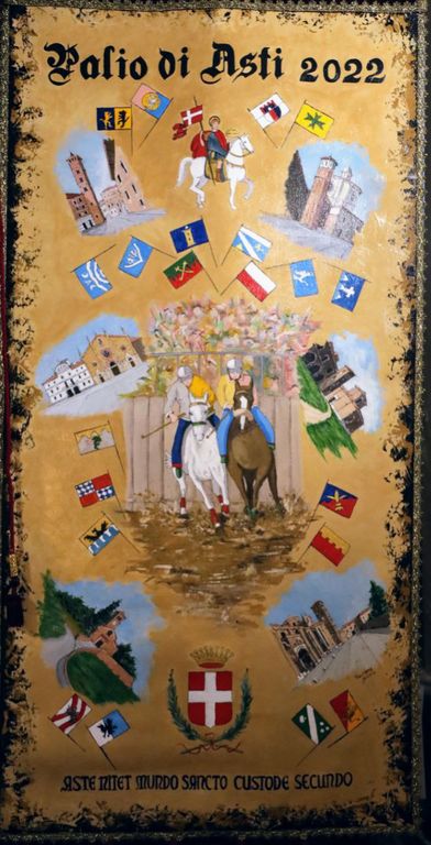I drappi sono stati svelati questa sera, con l'apertura del Maggio Astigiano e saranno esposti sul balcone del Municipio.
