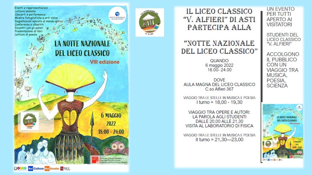 Anche il Liceo Classico “V. Alfieri” di Asti aderisce per la prima volta alla “Notte del Liceo Classico”, giunta quest’anno all’ottava edizione. L’iniziativa si svolgerà venerdì 6 Maggio 2022, dalle ore 18 alle 24, in contemporanea in 328 licei su tutto il territorio nazionale. L’evento è aperto a tutta la cittadinanza che sia interessata ad assistere e la serata sarà gestita dagli studenti che accoglieranno il pubblico con un viaggio tra musica, canto, danza, scienza. Si susseguiranno letture di poesie, discussioni filosofiche, musica, presentazioni di lavori e libri, piccole drammatizzazioni, a dimostrazione della grande creatività e vitalità degli studenti liceali.