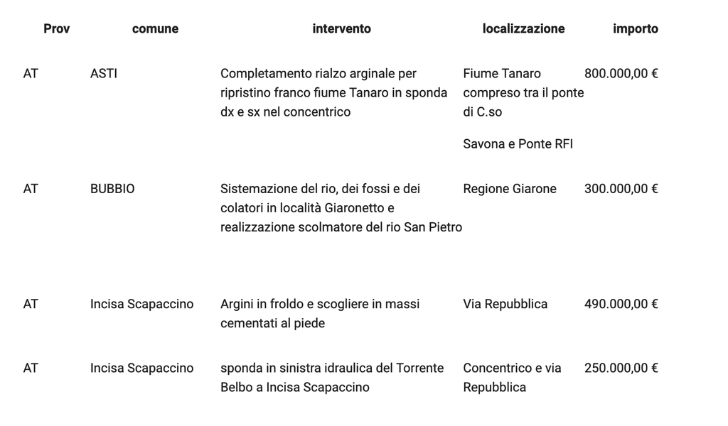 L’elenco delle opere, vagliato e approvato dall’Autorità di Bacino del fiume Po, è stato inviato al