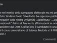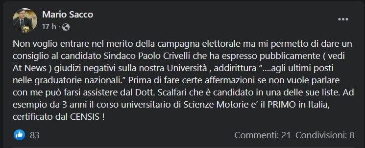 “Non voglio entrare nel merito della campagna elettorale – premette Sacco nel post – ma mi permetto di dare un consiglio al candidato Sindaco Paolo Crivelli (...) Prima di fare certe affermazioni se non vuole parlare con me può farsi assistere dal Dott. Scalfari che è candidato in una delle sue liste. Ad esempio da 3 anni il corso universitario di Scienze Motorie e’ il PRIMO in Italia, certificato dal CENSIS”.