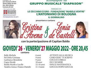 Giovedì 26 maggio, dalle 20.45 al Teatro Cristallo di San Damiano d’Asti si apre la 47°Festa canora per bambini under 12 che sarà tenuta a battesimo da Cristina D’Avena, madrina e conduttrice della serata, con la partecipazione di Capitan Baldo alias Pietro Ubaldi.