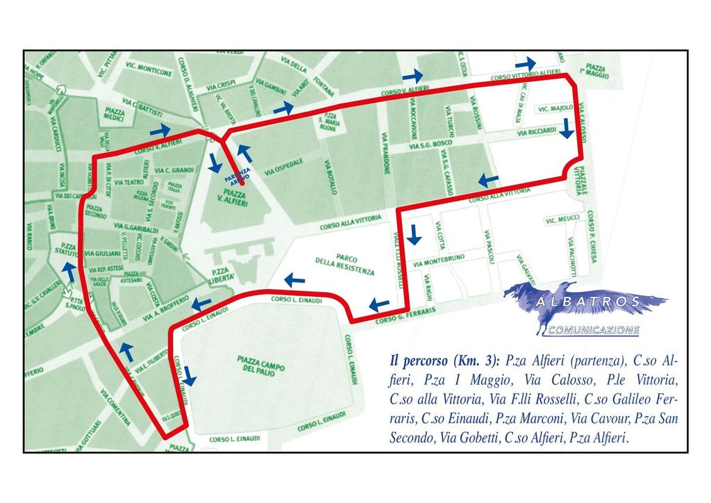 Importante novità riguarderà la partenza, programmata per le 20.30 dopo le premiazioni dei “Gruppi più numerosi” (Scuole, Comitati Palio, Associazioni, Società, ecct.). Non più il controviale di piazza Alfieri ma bensì l’interno della piazza, sotto lo sguardo di Vittorio Alfieri, monumento che nel frattempo sarà rimesso a “nuovo”. L’arrivo, sempre in piazza Alfieri, ma in senso opposto alla partenza.