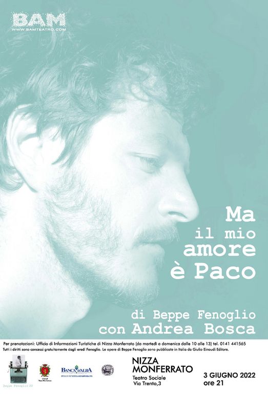 Appuntamento il 3 giugno a Nizza Monferrato (il 2 lo spettacolo sarà ad Alba), con lo spettacolo "Ma il mio amore è Paco", di Beppe Fenoglio, con Andrea Bosca.