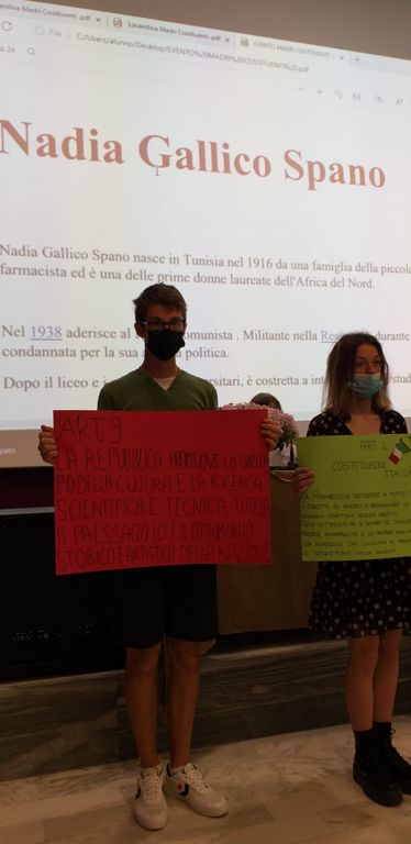 “Inoltre a celebrazione delle 21 Madri Costituenti della Repubblica e per restituire loro la doverosa visibilità e memoria - aggiunge Giovanna Cristina Gado - gli studenti e le studentesse con i docenti e le docenti, hanno ideato, realizzato e apposto all’acero campestre nell’area antistante l’Istituto, una targa dedicata alle Costituenti: un’ulteriore significativa azione didattica messa in campo, a conclusione dell’intensa mattinata, ricca di significative restituzioni improntate ai principi della democrazia paritaria e dell’emancipazione femminile, per i quali le Madri Costituenti si sono strenuamente impegnate nella costruzione della Costituzione della Repubblica Italiana”.