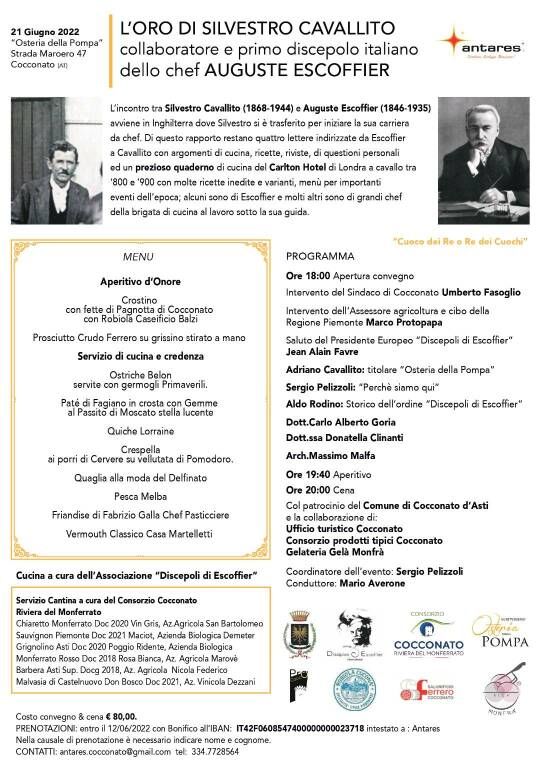 Martedì 21 giugno all'Osteria della Pompa di Cocconato si terrà il convegno sulla cucina della Belle Époque dal titolo "L'oro di Silvestro Cavallito, collaboratore e primo discepolo italiano di Auguste Escoffier, Re dei cuochi, cuoco dei Re".