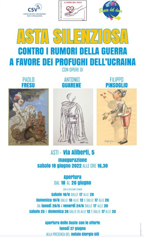 Contro i rumori della guerra e a favore dei profughi ucraini, l’Associazione “Il Dono del Volo”, in collaborazione con il CSVAA e la Banca del Dono, ha organizzato un’asta silenziosa con le opere che i maestri Paolo Fresu, Antonio Guarene e Filippo Pinsoglio hanno donato.