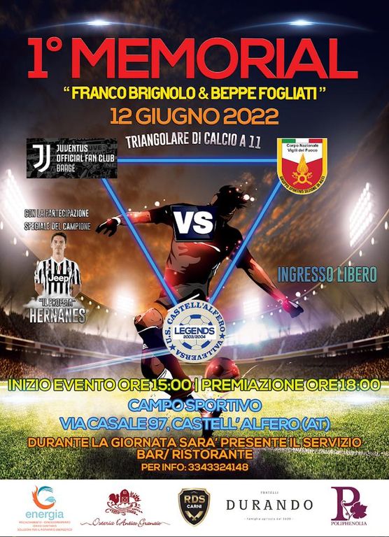 Domenica, a partire dalle 15, presso il campo sportivo di Castell’Alfero si svolgerà il primo “Memorial Franco Brignolo e Beppe Fogliati”, triangolare calcistico che vedrà di fronte la squadra dei vigili del fuoco di Asti, lo Juventus Club di Barge e il Castell'Alfero legends
