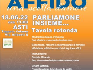 Interverranno Daniela Giraudo, responsabile della commissione famiglia del consiglio nazionale forense, Chiara Gattolin, presidente nazionale Gefyra, Saveria Ciprotti, garante per l'infanzia e l'adolescenza del comune di Asti e Raffaella Ferrari presidente del Lions Club che porranno l'attenzione sulla necessità di coinvolgere nuove persone nella rete delle famiglie affidatarie nella certezza che la chiave di lettura di quest'ufficio sia l'amore e la volontà di essere parte attiva della comunità in cui si vive.