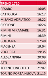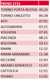 La partenza è da Torino Porta Nuova alle ore 6.20 (Asti alle ore 7,01 e Alessandria alle ore 7,21) con fermate intermedie solo a Voghera, Piacenza e Bologna (per consentire da qui un collegamento con l’alta velocità), tempi di percorrenza limitatissimi per arrivare prima dell’ora di pranzo in Riviera e raggiungere Pesaro poco dopo.