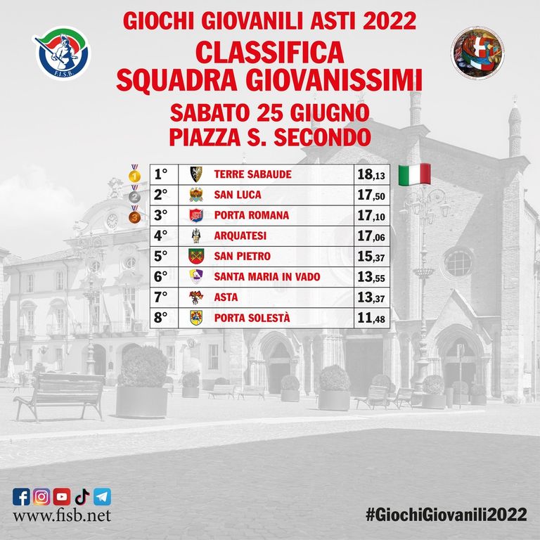 Per la prima volta la Città di Asti ospiterà la massima manifestazione federale per i più piccoli e, tra gli astigiani partecipanti il Borgo San Lazzaro, l' A.S.T.A, il Borgo San Pietro, Don Bosco, San Martino San Rocco e ovviamente Santa Caterina.