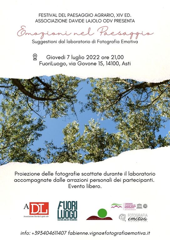 Giovedì 7 luglio alla residenza culturale Fuoriluogo (via Govone accanto al Tribunale di Asti) alle 21 con ingresso libero si svolgerà l’incontro “Emozioni nel paesaggio”, in cui verranno proiettate le foto scattate dai partecipanti al laboratorio di fotografia, tenuto da Fabienne Vigna il 28 maggio scorso nell’ambito della XIV edizione del Festival del paesaggio agrario, organizzato dall’Associazione culturale Davide Lajolo in collaborazione dall’Associazione Paesaggi vitivinicoli UNESCO.
