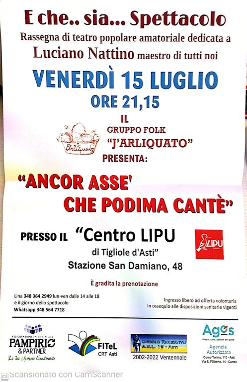 Venerdì 15 luglio il gruppo de gli"J'arliquato" di Castiglione si esibirà alla LIPU di Tigliole con lo spettacolo "Ancor asse' che podima cante'".