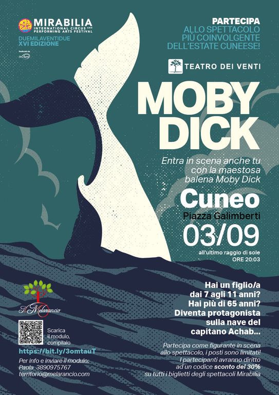 La compagnia il Teatro dei Venti all’interno dello spettacolo Moby Dick sviluppa un progetto speciale: un percorso laboratoriale di 4 giorni per i bambini dai 7 agli 11 anni e per gli over 65 fino alla messa in scena finale per le strade di Cuneo, la sera del 3 settembre.