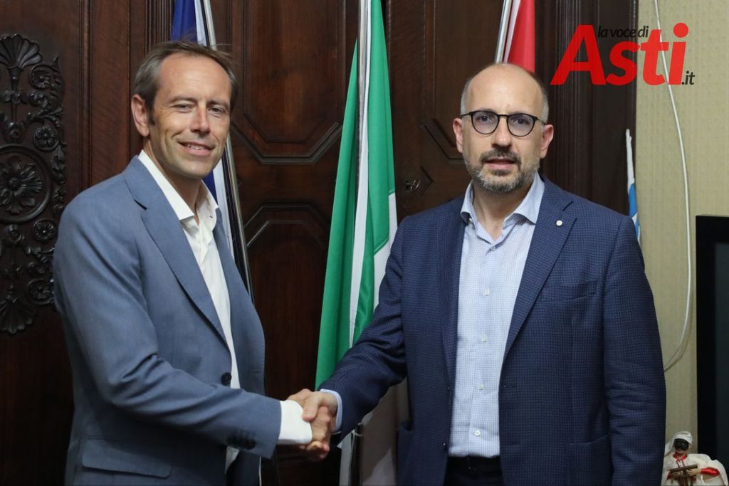 In visita ufficiale, infatti, il sindaco di Alessandria, Giorgio Abonante (csx), con la Giunta, accolti dal sindaco di Asti Maurizio Rasero e dalla Giunta astigiana.