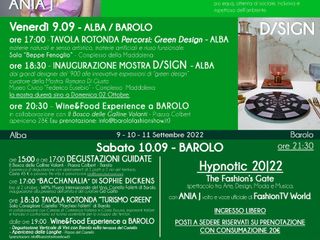 La kermesse internazionale sarà densa di spettacoli, convegni, concorsi per giovani designer e prevede l'inaugurazione di ben 2 eventi espositivi: Bacchanalia, mostra personale di Sophie Dickens (pronipote del romanziere britannico Charles Dickens) curata da Giò Gatto, che sarà inaugurata il 10 settembre alle 17 e avrà luogo nel “Wi-Mu – Museo del Vino” presso lo storico Castello Falletti di Barolo dal 10 settembre al 2 ottobre; D/SIGN - Percorsi invece sarà inaugurata il 9 settembre alle 18,30 presso il Museo Civico “F.Eusebio” di Alba e durerà anch‘essa fino al 2 ottobre, con un percorso espositivo curato da Romano Di Giusto che condurrà dai grandi designer del '900 alle più innovative espressioni di green design.