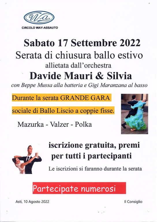 Sabato sera si svolgerà, presso il circolo Way-Assauto, la serata di chiusura del ciclo di ballo estivo, allietata dall’orchestra Davide Mauri & Silvia con Beppe Mussa alla batteria e Gigi Maranzana al basso.