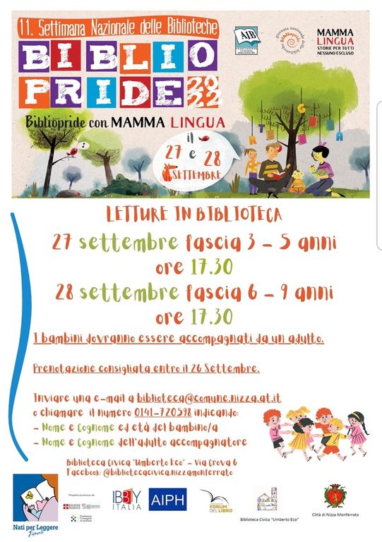 Il 27 e 28 settembre sono invece in programma, nell’ambito della Settimana Nazionale delle Biblioteche “Biblio Pride 2022”, delle letture pomeridiane, dalle 17.30: martedì 27 per la fascia d’età dai 3 ai 5 anni e mercoledì 28 per quella dai 6 ai 9 anni. Con la prerogativa di coinvolgere più bambini possibili, all’insegna dell’inclusività. Pertanto sono in programma letture in diverse lingue. Per prenotare, entro il 26 settembre, si può inviare una mail a biblioteca@comune.nizza.at.it o chiamare lo 0141/720598, indicando nome, cognome ed età del bambino partecipante, oltre a nome e cognome dell’adulto accompagnatore.