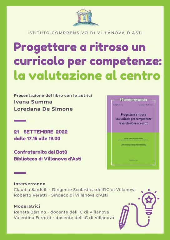 Progettare a ritroso un curricolo per competenze: la valutazione al centro” è il titolo dell’ultimo libro di Ivana Summa e Loredana De Simone, edito da Euroedizioni Torino, che sarà presentato oggi, mercoledì 21 settembre, nella Confraternita dei Batù di Villanova d’Asti, sede della Biblioteca Comunale, alle 17,15.