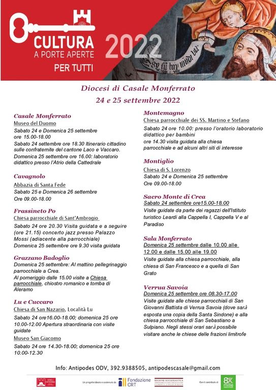 In occasione della rassegna promossa dal Progetto Città e Cattedrali, “Cultura a porte aperte” e delle Giornate Europee del Patrimonio previste per sabato 24 e domenica 25 settembre, la Diocesi di Casale Monferrato in collaborazione con i parroci, i volontari parrocchiali e alcune amministrazioni comunali aderisce all’iniziativa con aperture straordinarie ed eventi volti a far conoscere e a condividere l’immenso patrimonio culturale diocesano.