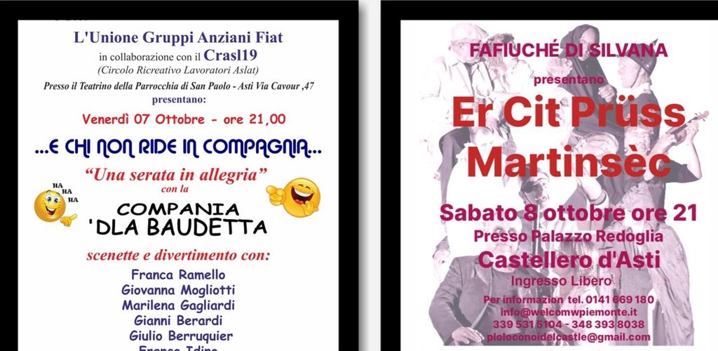 Sabato 8 ottobre, organizzata da Comune e dalla Proloco di Castellero, sempre alle ore 21, a Castellero d'Asti, nell'ambito della 40 Fiera della Nocciola a Palazzo Redoglia, la Compagnia "I Fafiuche' di Silvana" in:"Er Cit Pruss Martinsec" (commedia brillante in piemontese) con la regia di Cristina Ghiringhello