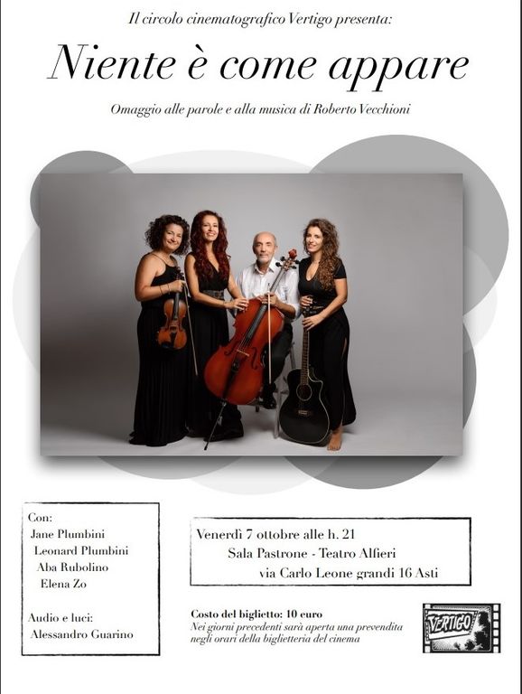 Venerdì sera, alle 21, la Sala Pastrone ospiterà “Niente è come appare”, spettacolo proposto da Vertigo in omaggio alle parole scritte e cantate da Roberto Vecchioni, portato in scena da Jane Plumbini (cantante), Elena Zo (attrice), Aba Rubolino (violoncellista) e Leonard Plumbini (violoncelllista e chitarrista).