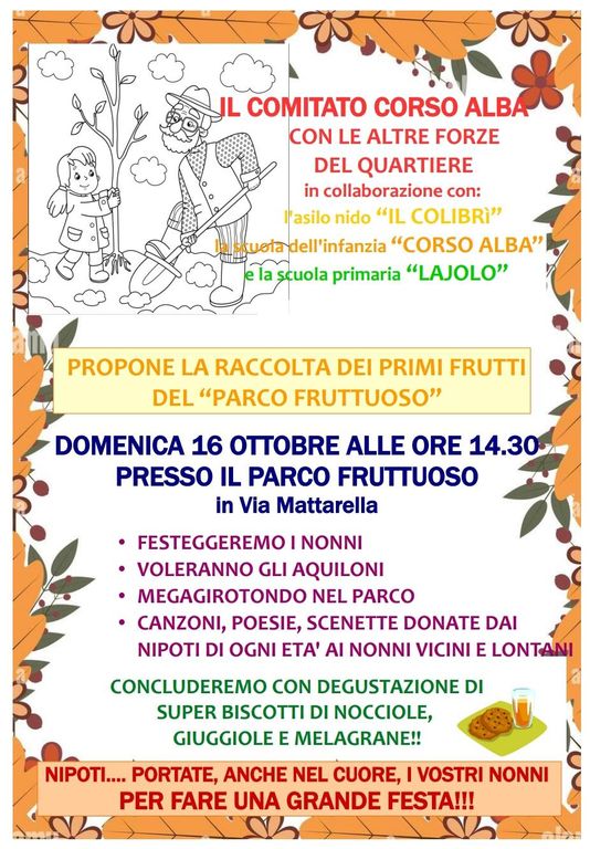Il Comitato Corso Alba, con il supporto di altre realtà del quartiere e con la collaborazione dell’asilo nido “Il Colibrì”, della scuola dell’infanzia “Corso Alba” e della primaria “Lajolo” propone la raccolta dei primi frutti del “Parco Fruttuoso” di via Mattarella.