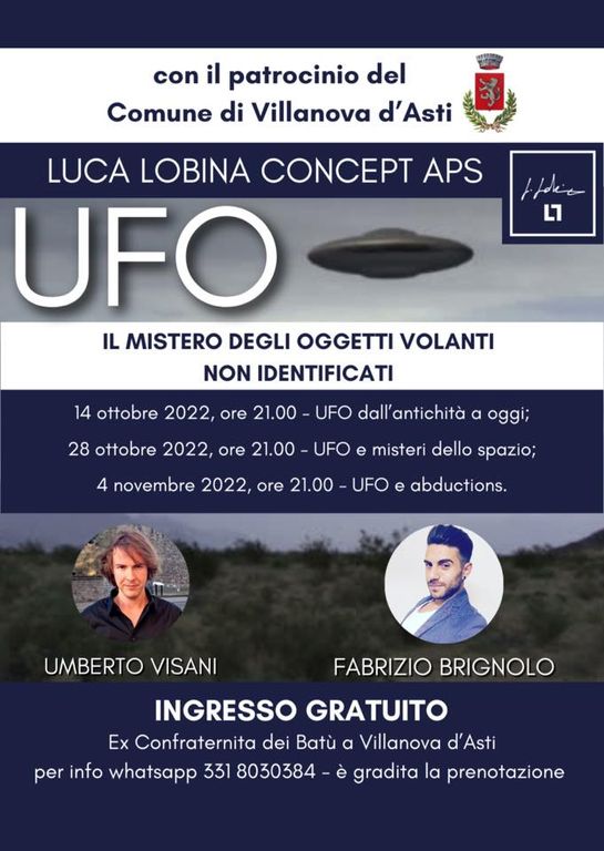 A Villanova d'Asti si parla dell'affascinante argomento UFO con 3 incontri organizzati da Luca Lobina concept Association con il patrocinio del Comune di Villanova d’Asti.