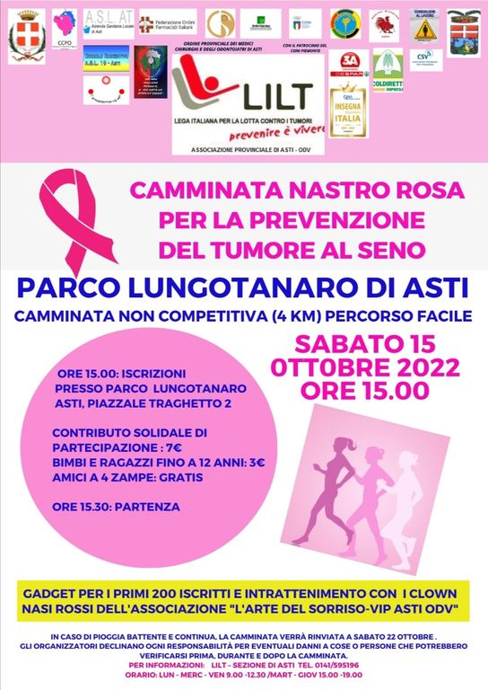 La camminata (non competitiva), di 4 chilometri sarà aperta a tutti, dato il percorso facile; gadget per i primi 200 iscritti e intrattenimento con i clown Nasi rossi dell'associazione "L'arte del sorriso Vip Asti Odv".
