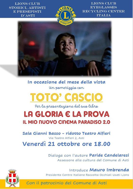 In occasione del mese della vista il Lions Club Storici, Artisti e Presepisti d’Asti, ospiterà Totò Cascio, il bambino del film premio Oscar “Nuovo Cinema Paradiso”, per presentare il suo libro, "La Gloria e la Prova - il mio nuovo Cinema Paradiso 2.0".
