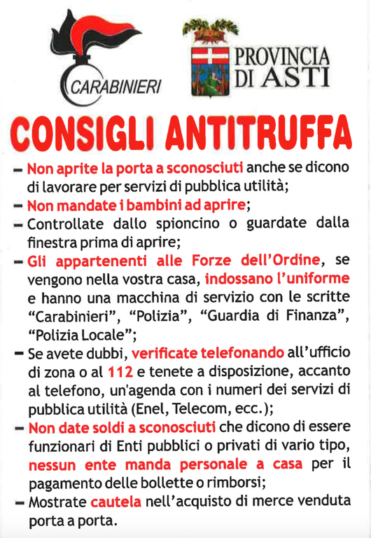Nella sola giornata di ieri ad Asti almeno quattro i tentativi, di cui uno andato a segno per un migliaio di euro. Intanto continua la campagna informativa dei carabinieri, con incontri di sensibilizzazione sul territorio provinciale. Tutti i consigli