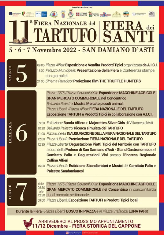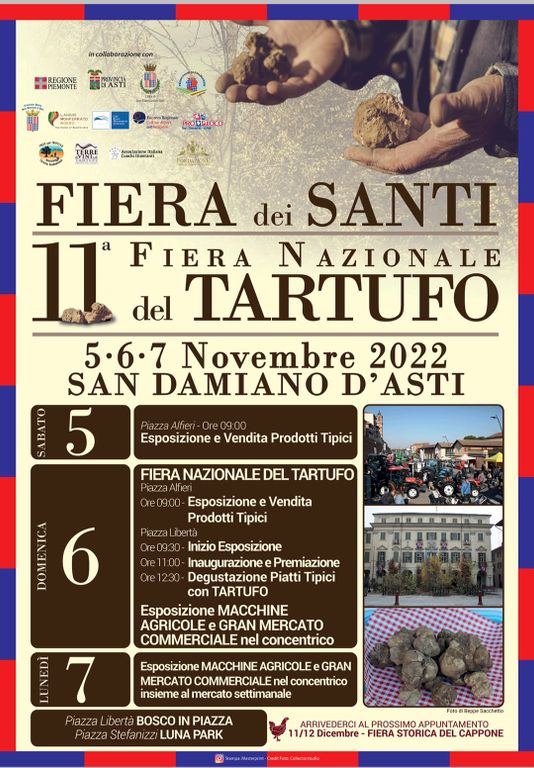 Domenica 6 novembre si svolgerà la prima edizione nazionale della Fiera del tartufo a San Damiano, ma già da sabato ci saranno alcune iniziative: in piazza Alfieri esposizione da sabato mattina di prodotti tipici sia piemontesi che da altre regioni.
