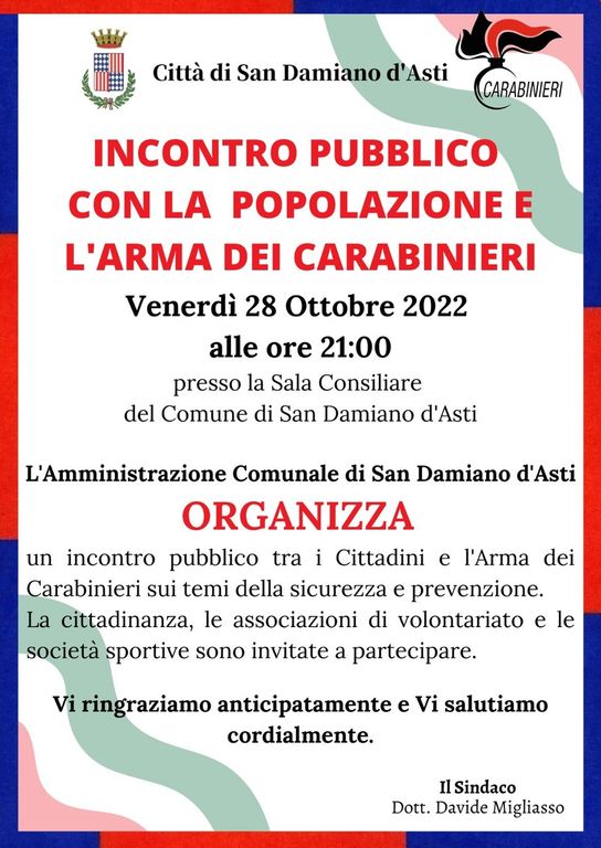 Venerdì alle 21 in sala consiliare si svolgerà un nuovo incontro tra la popolazione e l'Arma con il comandante di Stazione, Corrado Scola, in tema prevenzione e sicurezza.