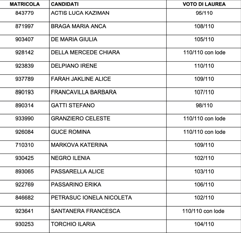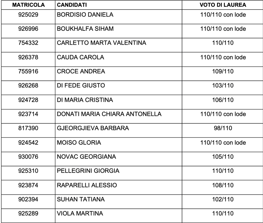 Il punteggio finale del voto di laurea, nella seduta del mattino, espresso in centodecimi, è riportato nella tabella seguente: