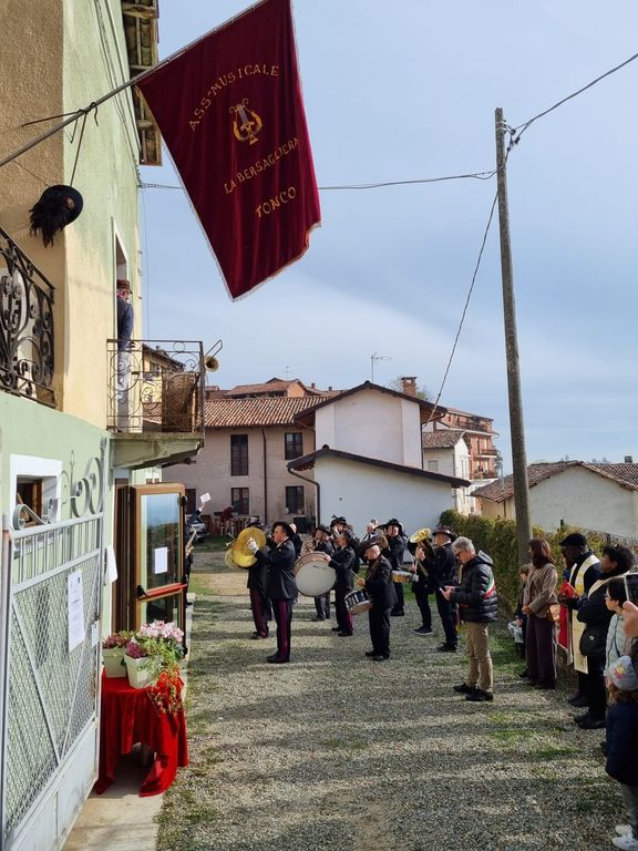 All'inaugurazione erano presenti oltre al sindaco e ai consiglieri comunali, il presidente del GAL, Mario Sacco, che ha evidenziato la funzione culturale e sociale del progetto, il parroco di Tonco Ahlina-Atama Kodzo che ha dato la benedizione e i familiari di Bruno Bezzo. “Bruno Bezzo, che iniziò a suonare la tromba all’età di 18 anni, ha legato il suo nome a quello de La Bersagliera, di cui è stato maestro fino nel 2013, quando aveva 84 anni. È sempre stato punto di riferimento per la Banda e grazie a lui in passato molti giovani si sono avvicinati e appassionati alla musica: non potevamo che dedicare la Casa della Musica a lui” ha concluso il primo cittadino. A prendere la parola anche il figlio di Bruno Bezzo, Guido, trombettista come il padre e membro della banda, che ha ricordato la lunga storia di questa realtà musicale e ringraziato l'Amministrazione comunale.