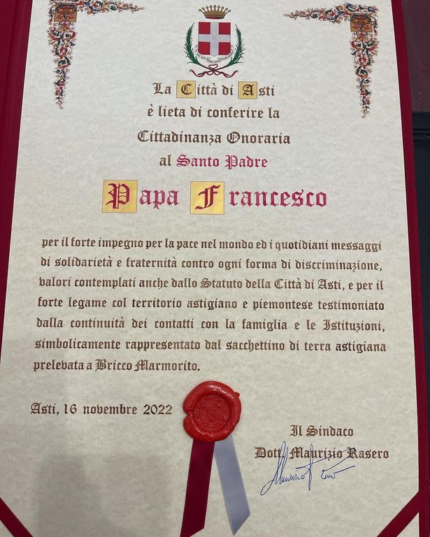 Già il primo appuntamento di giornata, dopo la cena con il vescovo di Asti monsignor Marco Prastaro e la notte passata in Vescovado, avrà un forte valore simbolico, poiché al Santo Padre verrà formalmente conferita, nel corso di un incontro privato in programma in Curia nella prima mattinata, la cittadinanza onoraria della Città di Asti, decisa all’unanimità nel corso del più recente Consiglio comunale (CLICCA QUI per rileggere l'articolo).