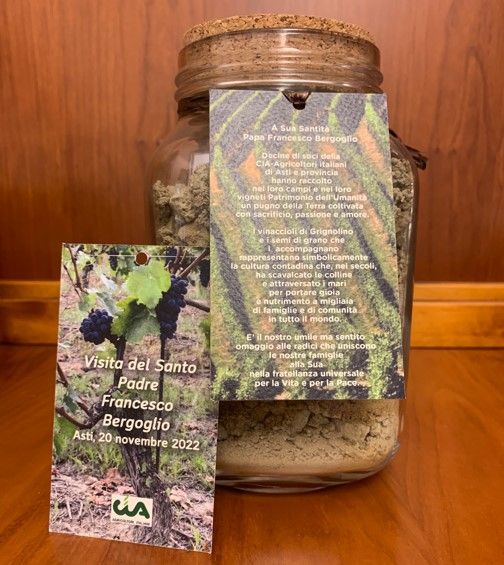 Cia Agricoltori Italiani di Asti ha pensato di omaggiare Papa Francesco, in visita nei luoghi d’origine della sua famiglia, con un dono semplice che simboleggia la vicinanza degli agricoltori alla sua missione di fede e fratellanza: in un vaso sono stati raccolti la terra del Monferrato e i semi di grano e grignolino offerti dai soci.
