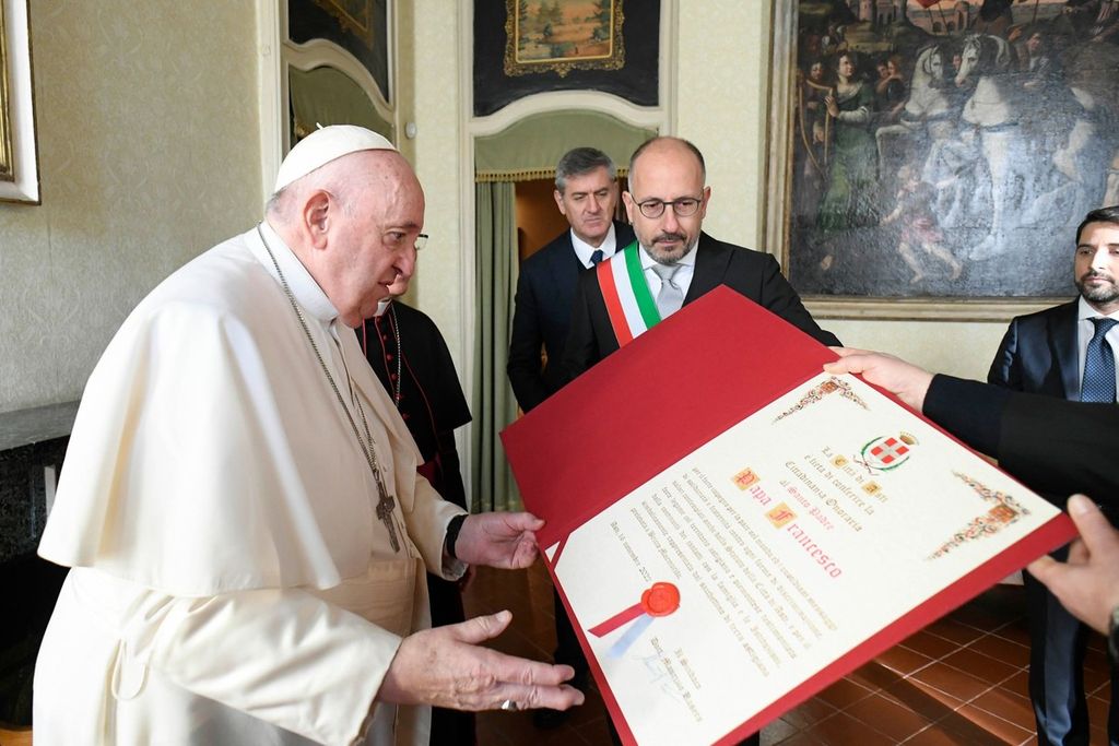 Questa mattina, prima di uscire dal palazzo vescovile, Papa Francesco ha incontrato il sindaco di Asti Maurizio Rasero che, accompagnato per l’occasione dai componenti della sua giunta e dal presidente del Consiglio comunale Federico Garrone, gli ha consegnato la pergamena della cittadinanza onoraria disposta all’unanimità dal Consiglio comunale cittadino (CLICCA QUI per rileggere l'articolo)