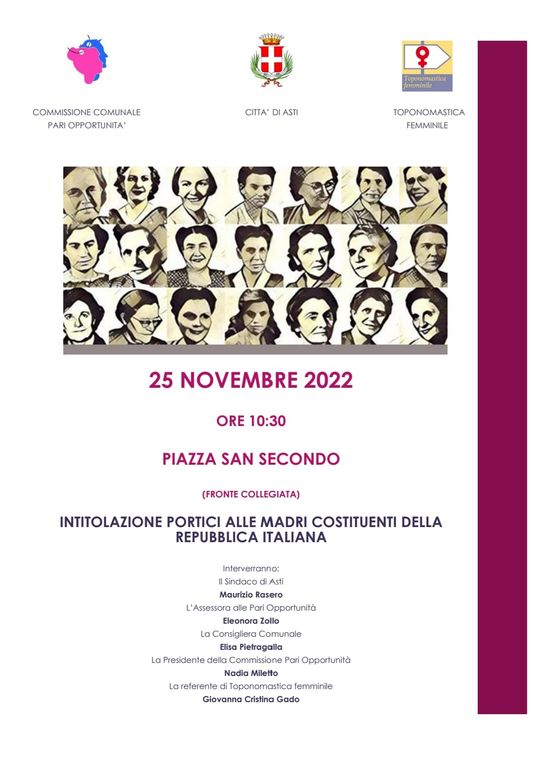 In occasione della Giornata internazionale per l’eliminazione della violenza sulle donne, il sindaco di Asti Maurizio Rasero, la consigliera Comunale Elisa Pietragalla e la presidente della Commissione Pari Opportunità Nadia Miletto con la Commissione Pari Opportunità e Toponomastica femminile, intitoleranno i Portici di piazza San Secondo (fronte Collegiata) alle Madri Costituenti della Repubblica Italiana.