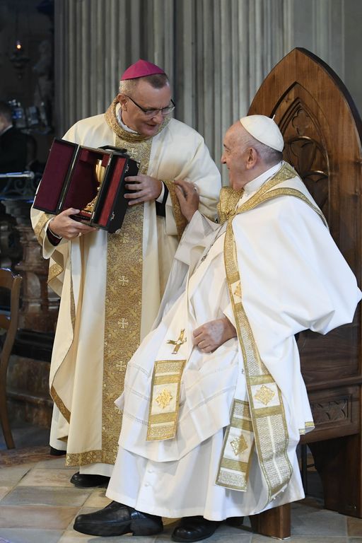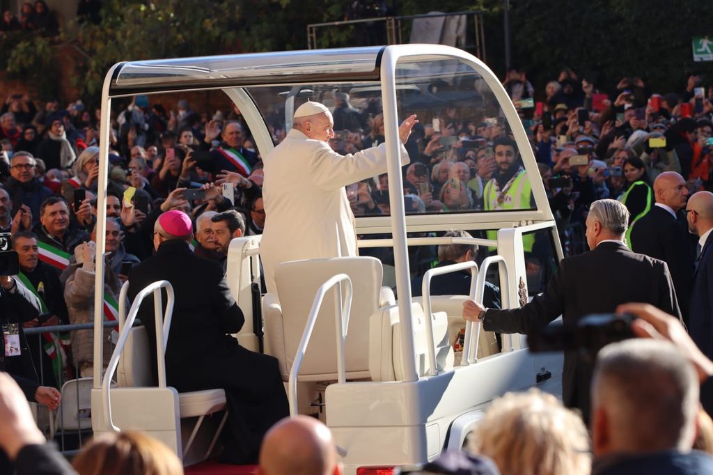 Un'omelia e un Angelus ricchi di contenuti: povertà, guerra, attenzione all'altro: ""Oggi ci vogliono giovani davvero trasgressivi, non conformisti schiavi di un cellulare, ma che cambino il mondo. Stiamo vivendo una carestia di pace, pensiamo a tanti luoghi in guerra ad iniziare dalla tormentata Ucraina. Invochiamo Maria, Regina della Pace, la Madonna cui è dedicata questa bella Cattedrale. A lei affido i malati, le famiglie e ciascuno di voi".