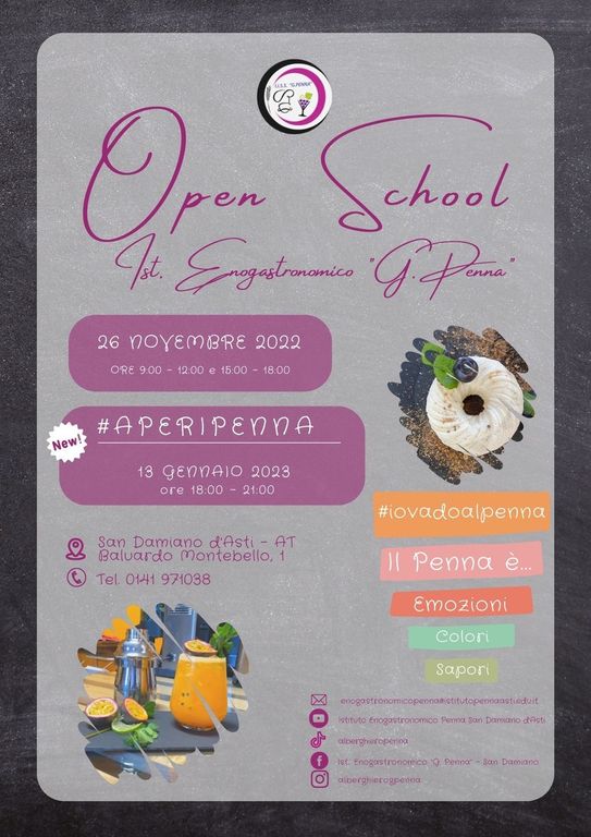 Il 26 novembre nella sede di Asti dalle 9 alle 12 e dalle 14 alle 17, open school, mentre il 17 dicembre la scuola sarà presente al Salone di Orientamento Provinciale che si terrà nei locali del Polo Universitario Astiss di piazzale De Andrè.