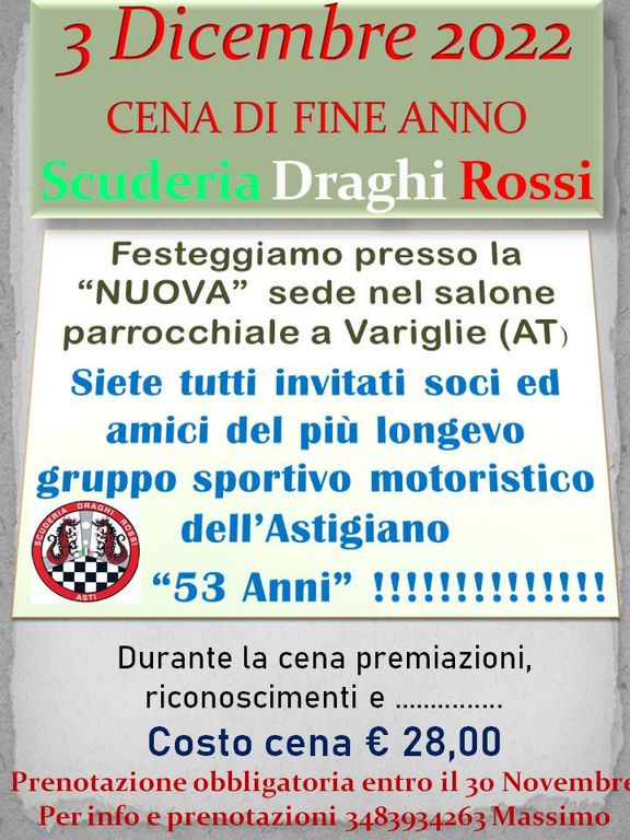 Sabato 3 dicembre nella nuova sede della Scuderia Draghi Rossi, presso il salone parrocchiale di Variglie, si terrà la tradizionale cena di fine anno dei Draghi.