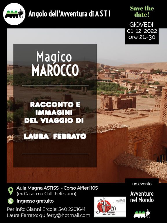 Giovedì 1 dicembre, alle 21.30, nell’Aula Magna dell’Astiss - Piazzale De Andrè (ex caserma) - continuano i racconti di viaggio con: "Marocco", di Laura Ferrato.